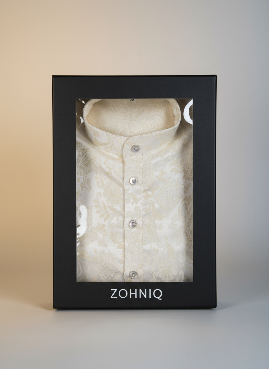 Step into refined tradition with this elegant white kurta, crafted from premium polyester jacquard fabric that offers both durability and a soft sheen. The intricately woven self-design pattern adds depth and character while maintaining a minimalist aesthetic. Designed with a band collar and full sleeves, this kurta brings together modern tailoring and classic elegance, perfect for festive occasions, cultural events, or styled down for a polished everyday look.